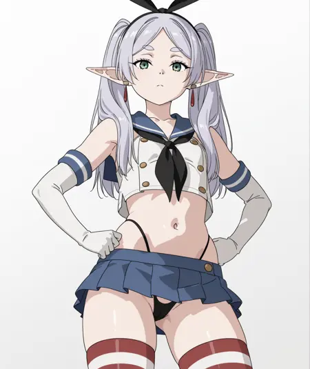 gloves, navel, school uniform, hairband, serafuku, sleeveless, elbow gloves, white gloves, sailor collar, crop top, neckerchief, black neckerchief, black hairband, blue sailor collar,