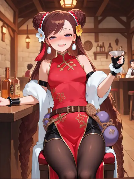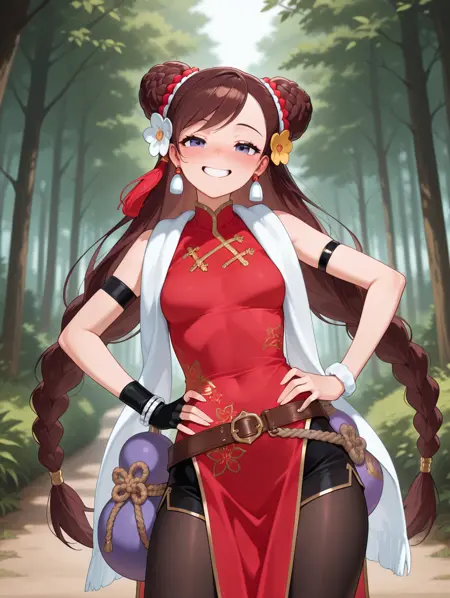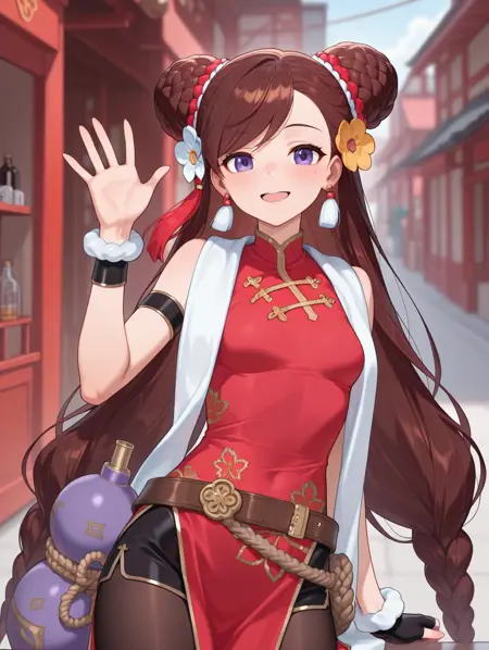 lynn, 1girl, 棕色头发, 长发, 极长发, 发髻, 双髻, 辫子, 编发, 紫色眼睛, 小乳房, 中国服饰, 连衣裙, 长筒袜, 旗袍, 发饰, 红色连衣裙, 花朵, 耳环, 珠宝, 头发花饰, 黑色长筒袜, 无袖, 露肩, 黑色臂环, 白色手镯, 黑色手镯, 一只露指手套, 蓬松披肩, 白色披肩, 无袖连衣裙, 骨盆帘, 绳索, 腰带, 腰带上挂葫芦