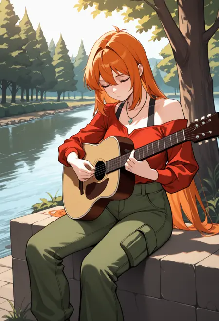 Trigger + Appearance: elh4ym, long hair, orange hair, hair between eyes, blue eyes
