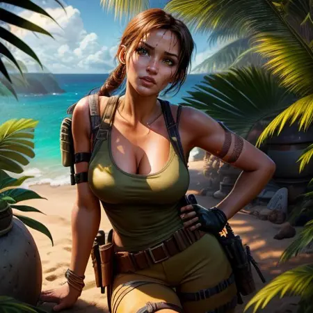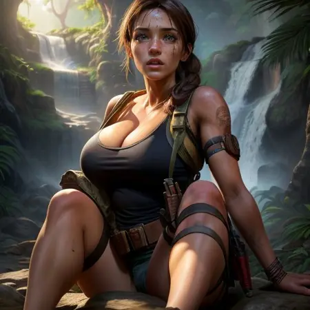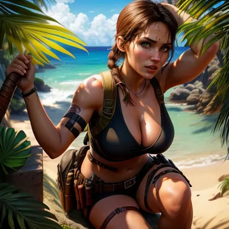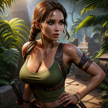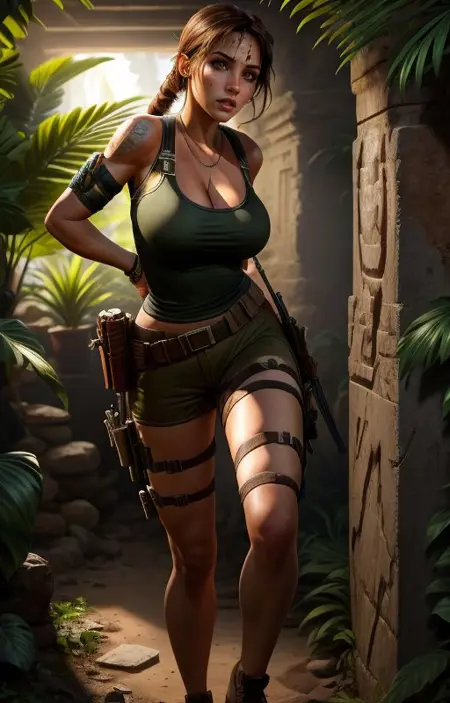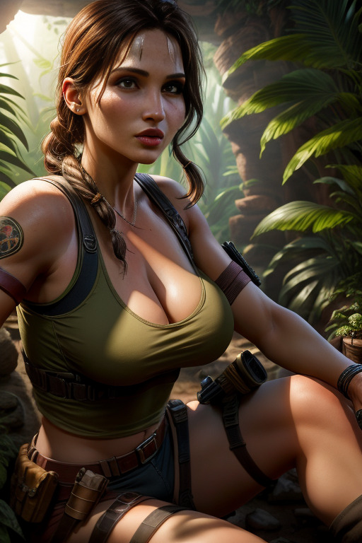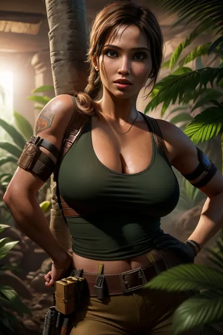 - Positive Prompt: ((detailed)), ((masterpiece)), ((best quality)), ((Astounding)), ((Enchanting)), (Striking), woman, (lara croft:1.2), (tomb raider:1.2), (tomb:1.1), natural light inside tomb, jungle, plants in background, (detailed face:1.2), clear skin, (cleavage:1.1), perfect light, perfect shadows, lora:3DMM_V12:0.6, lora:add_detail:0.7