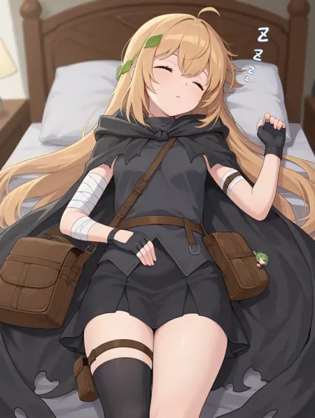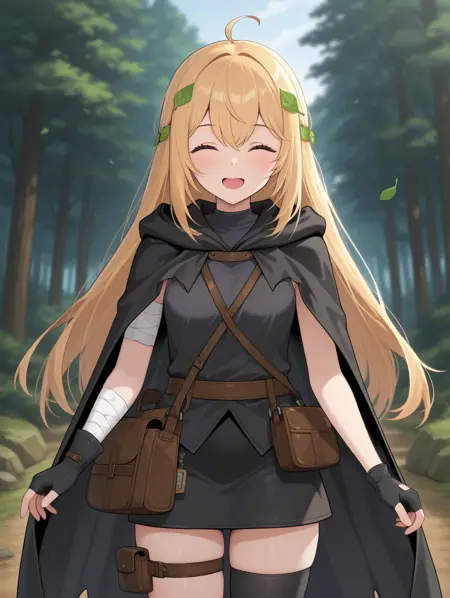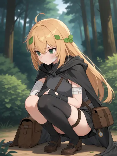 futureknight, 1girl, solo, 금발, 긴 머리, ahoge, 녹색 눈, 붕대, 장갑, 치마, 허벅지 긴 양말, 손가락 없는 장갑, 후드, 단일 허벅지 양말, 붕대 감긴 팔, 망토, 겉옷, 머리 장식, 검은 치마, 가방, 후드 내려짐, 머리에 잎, 벨트, 검은 망토, 검은 허벅지 양말, 검은 겉옷, 셔츠, 검은 장갑, 갈색 가방, 후드 달린 망토, 허벅지 스트랩, 주머니,