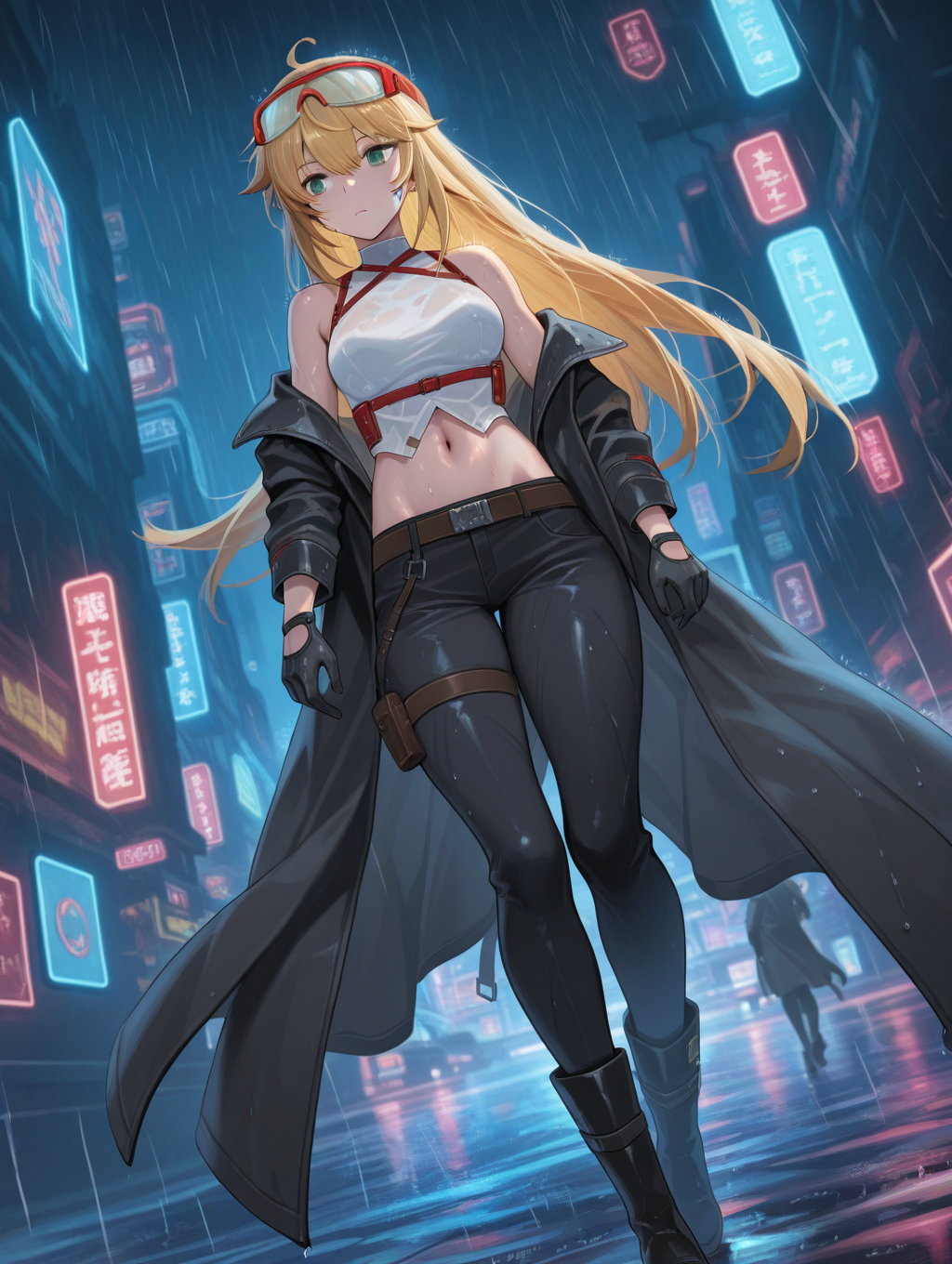 futureknight, 1girl, solo, 금발, 긴 눈, 녹색 눈, 고글, 장갑, 머리에 고글, 배꼽, 검은 바지, 바지, 검은 장갑, 부츠, 벨트, 셔츠, 허리, 흰 셔츠, 재킷, 검은 신발, ahoge, 검은 재킷, 열린 옷, 코트, 머리에 안경, 소매 없음, 소매 없는 셔츠, 어깨 노출, 중간 크기 가슴, 검은 코트, 어깨 노출,