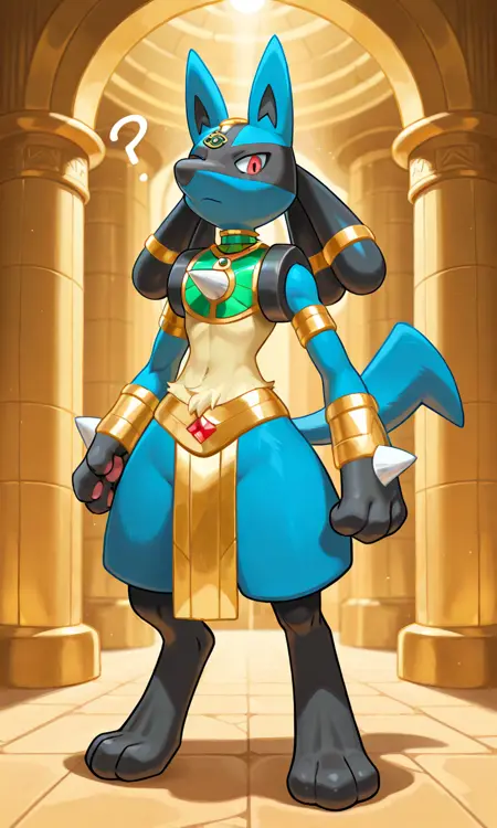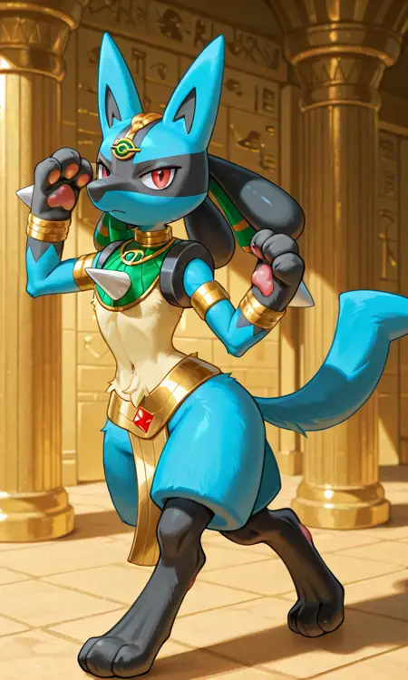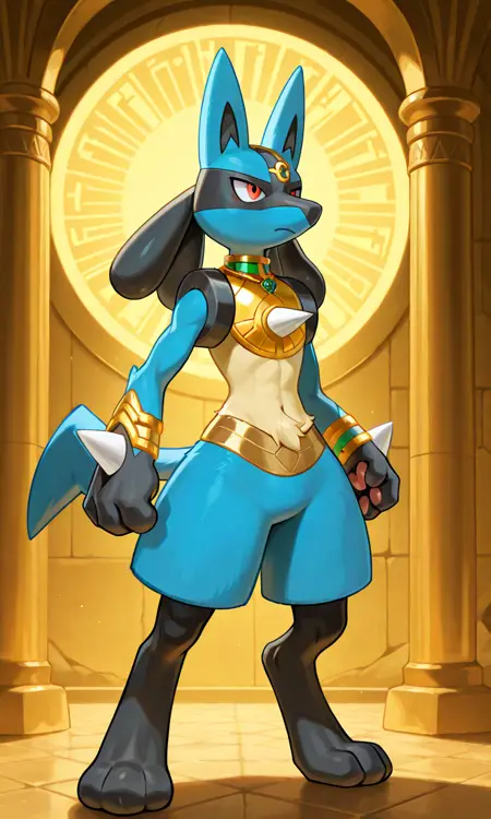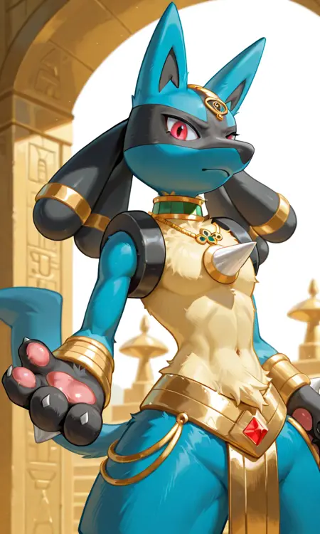 LucarioRS, pokemon (creature), lucario, Blue Fur, Chest Spike, Red Eyes, yellow chest fur with thicker patches on the collar, Spike on Hands, pawpads, Two tone fur, Egyptian necklace, jewelry