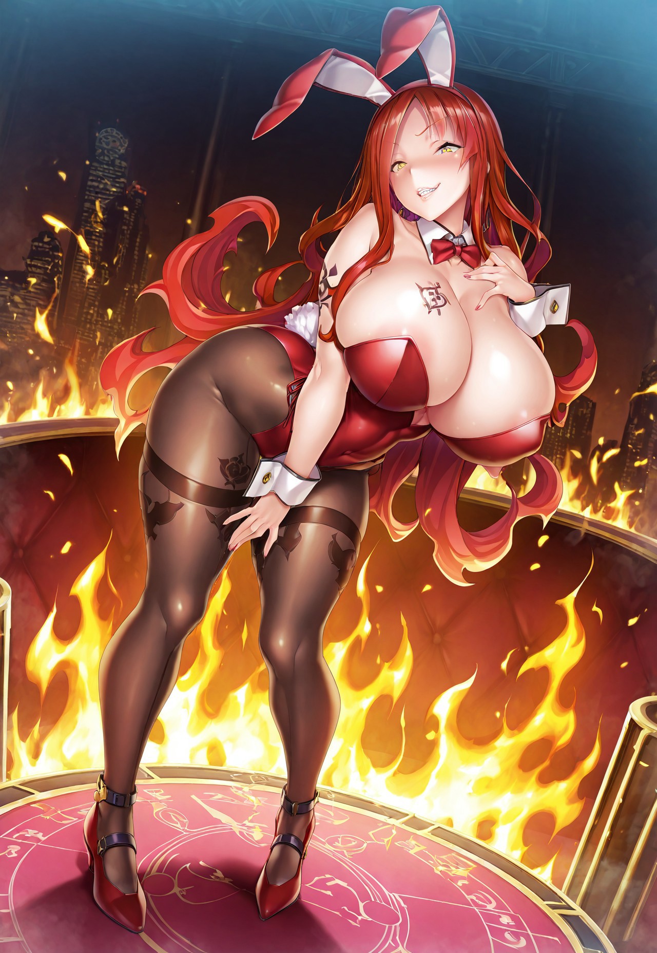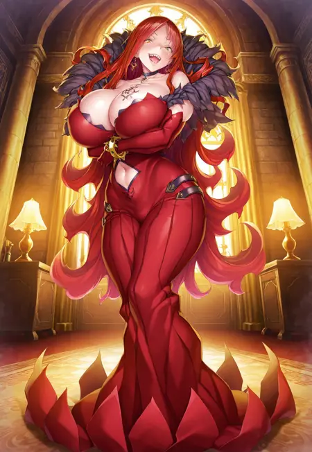 Tags: Astaroth, red hair, long hair, yellow eyes, lips, huge breasts, wide hips, curvy, sharp sheet, potion (moudamepo)