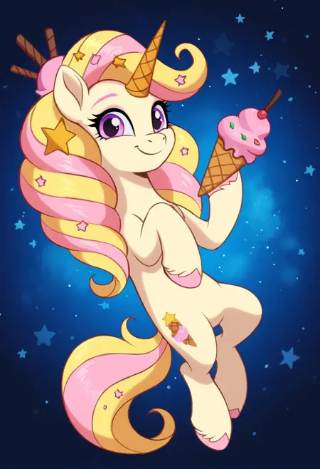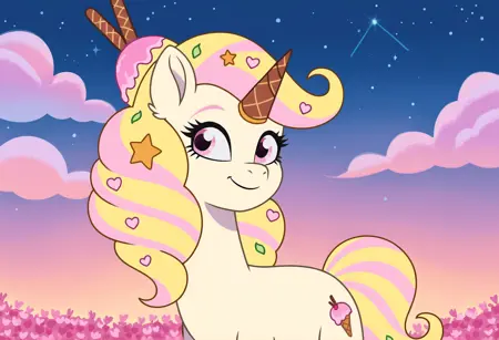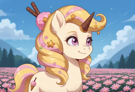 an unusual hairstyle consisting of large curls of yellow and pink flowers, the curls are decorated with small stars and other shiny elements, from the back of the hairstyle, two brown horns stick out, reminiscent of wafer rolls