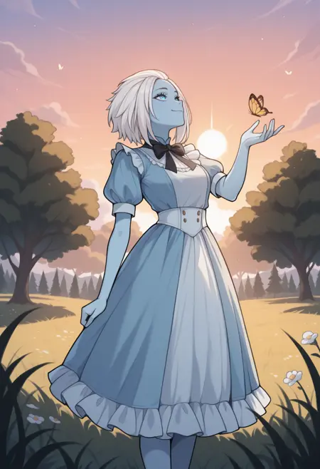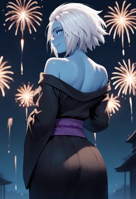 トリガー+外見: mara sov, 青い肌, 白い髪, 後ろに流した髪, 青い目
