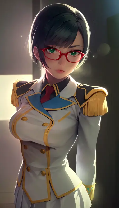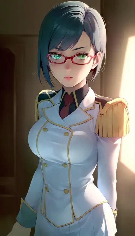 1girl, solo, military uniform, jacket, epaulettes, green eyes, blue hair, cowboy shot, looking at viewer;