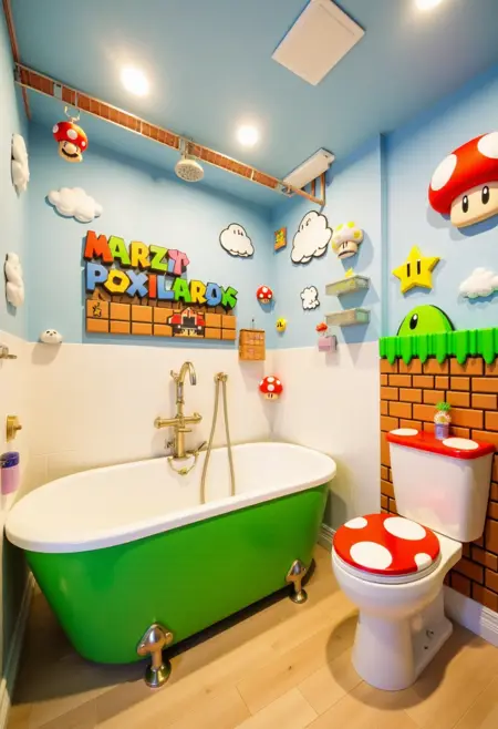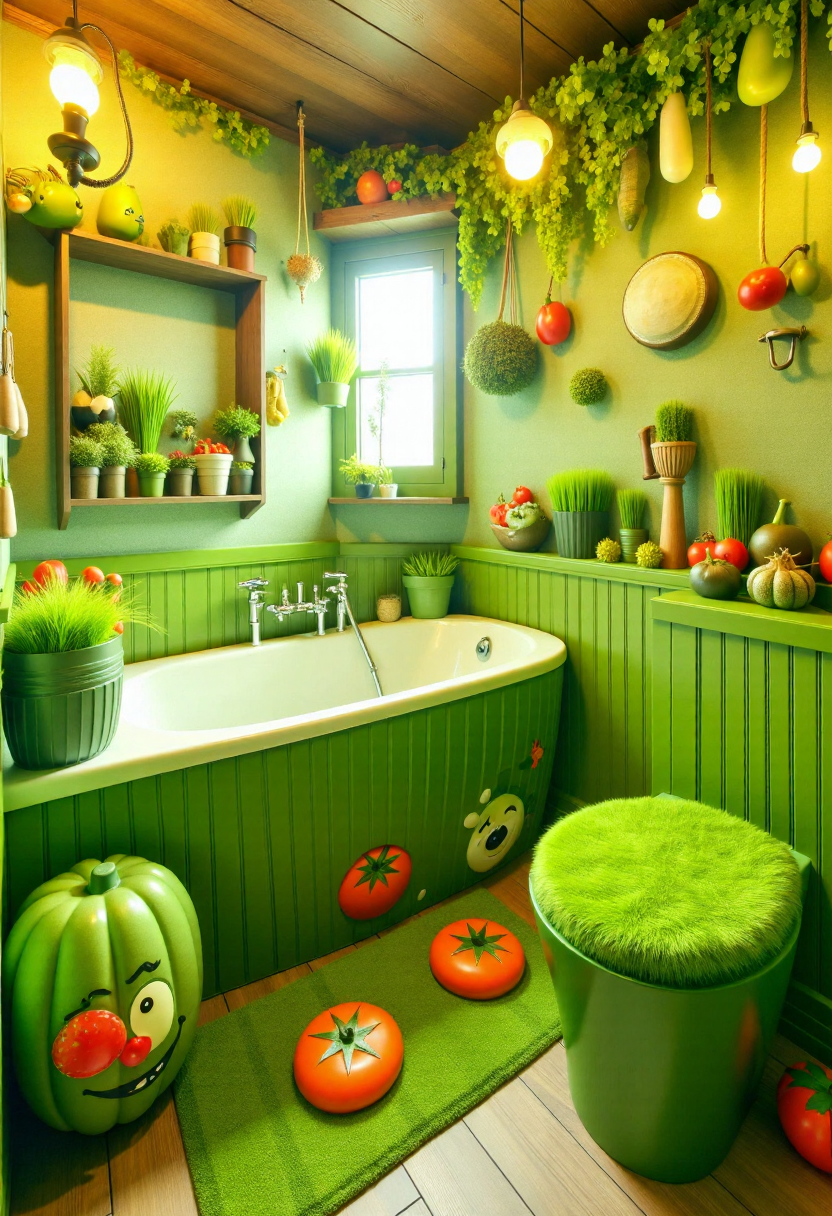 권장 프롬프트: (SUBJECT) 테마의 욕실 사진, (COLOR) 세부 요소, (SUBJECT) 모양의 욕조, 그리고 (SUBJECT) 변기 포함.