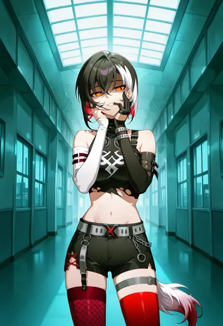1girl, black hair, Ming-Dusk-Inferno, white hair, colored inner hair, orange eyes, short hair, black shorts, grey belt, black fishnets, red thighhighs, tail, mismatched legwear, asymmetrical legwear, black thigh strap, shoulder straps, black shirt, torn clothes, torn shirt, midriff, navel, alt crop top, black crop top, alt turtleneck, sleeveless shirt, bare shoulders, detached sleeves, black sleeves, single sleeve, white arm warmers, single arm warmer, black gloves, single glove,