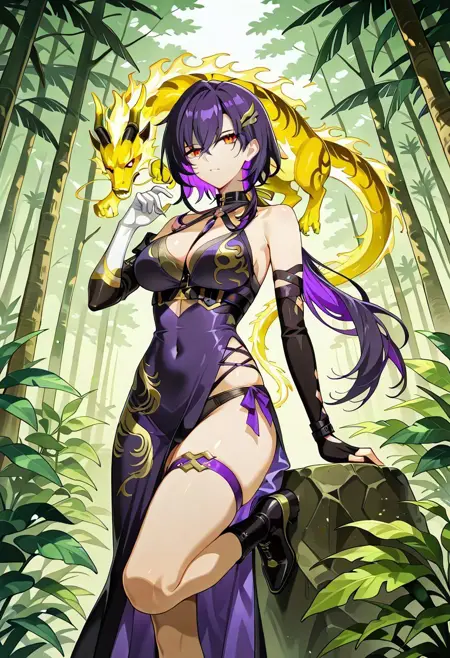 1girl, Ming-Thunderous-Dragon, long hair, low ponytail, orange eyes, colored inner hair, purple hair, black panties, covered navel underwear, hair ornament, dress, purple dress, black dress, side slit, two-tone dress, cross-laced clothes, halter dress, underbust, covered breasts, black bra, half-skirt, purple skirt, purple thigh strap, bare shoulders, detached sleeves, black sleeves, black gloves, white gloves, mismatched gloves, asymmetrical gloves, fingerless gloves, between breasts, black collar, black halterneck,