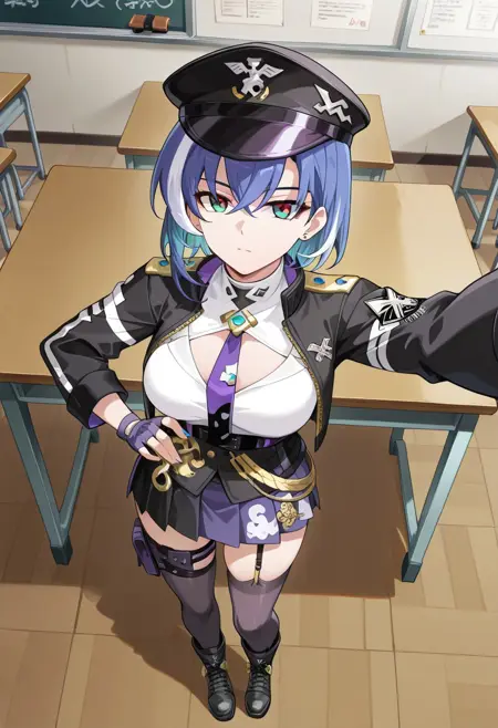 1girl, Ming-The-noise-was-long, blue hair, multicolored hair, a black military-inspired jacket with blue accents, a white inner shirt, and a short pleated skirt with a gradient from dark blue to purple, black thigh-high stockings, one featuring a white emblem, a garter belt on her left thigh, fingerless gloves, and a black military-style cap with gold accents, Black combat boots with glowing cyan soles,