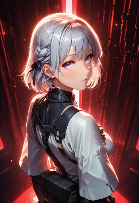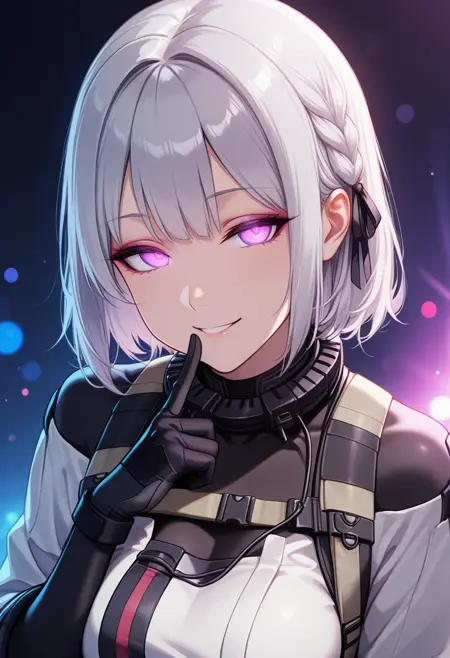 외모: 자주색 눈, 회색 머리, 단발, 머리 리본, 땋은 머리