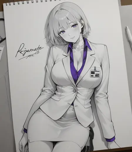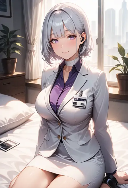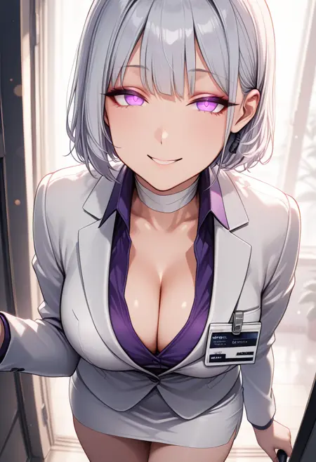 옷차림: 흰색 재킷, 보라색 셔츠, 정장, 비즈니스 정장, 신분증, 미니스커트, 흰색 치마, 연필 스커트, 다리 노출, 검은 신발, 신발, 붕대 감은 목, 이어피스