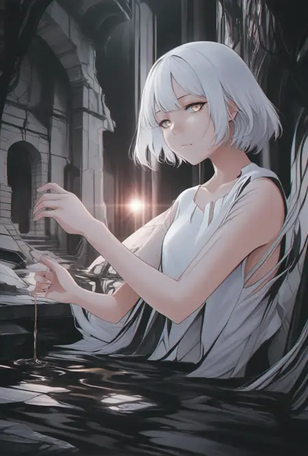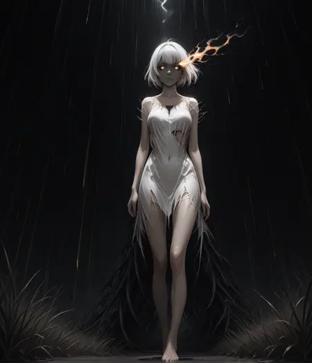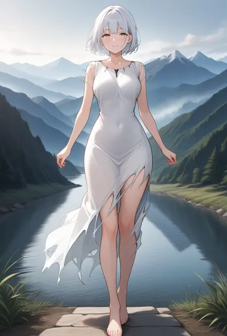옷차림: 찢어진 드레스, 흰색 드레스, 다리 노출, 맨발