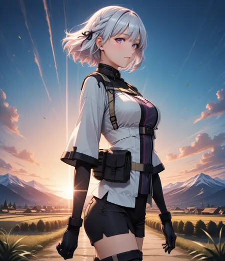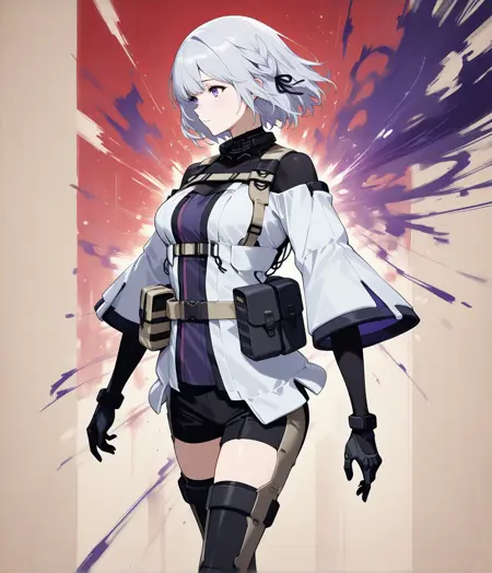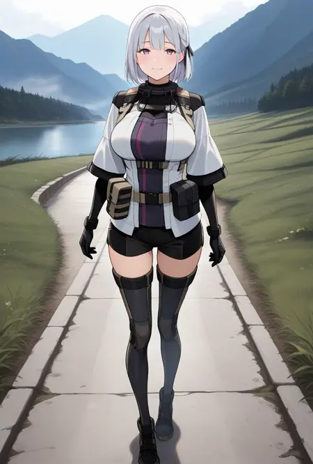옷차림: 군복, 팔꿈치 장갑, 검은 장갑, 갑옷 부츠, 검은 신발, 흰색 재킷, 택티컬 의상, 검은 반바지, 부분 바디수트, 허벅지 부츠, 가슴 하네스, 벨트 주머니