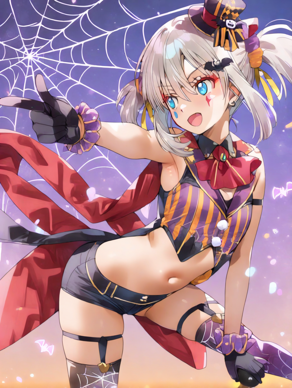 프롬프트 예시: kijyutusi,solo,halloween costume,sleeveless,striped shirt,navel,thighhighs,spider web print thighhighs,scrunchie,black gloves,navel,mini hat,makeup,short shorts,red cloth,tailcoat,