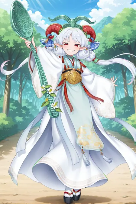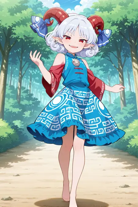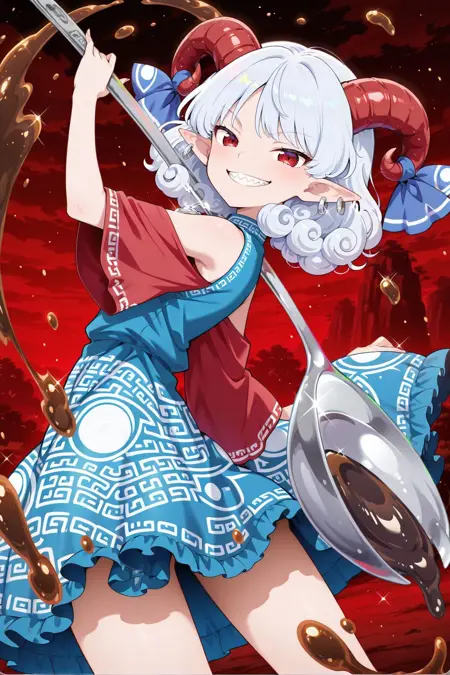 toutetsu yuuma, 1girl, solo, red eyes, white hair, short hair, curly hair, red horns, curled horns, sharp teeth,