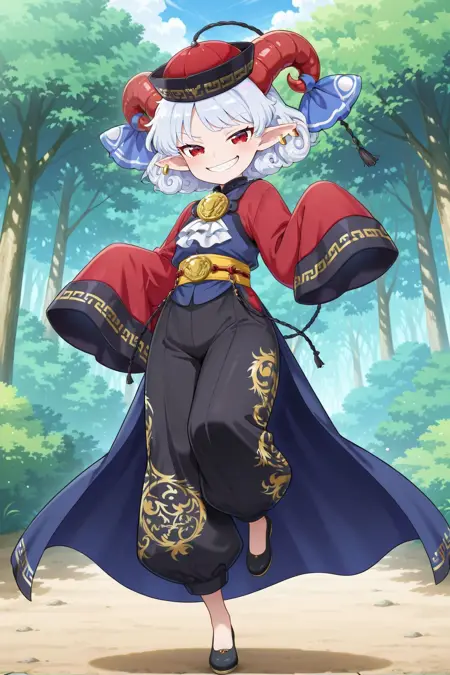 toutetsu yuuma, 1girl, solo, red eyes, white hair, short hair, curly hair, red horns, curled horns, sharp teeth, horn ribbon, blue ribbon, toutetsu yuuma \(all-you-can-devour banquet\), alternate costume, qingdai guanmao, black hat, red hat, chinese clothes, blue chinese clothes, long sleeves, sleeves past fingers, sleeves past wrists, wide sleeves, meandros print, red sleeves, black pants,