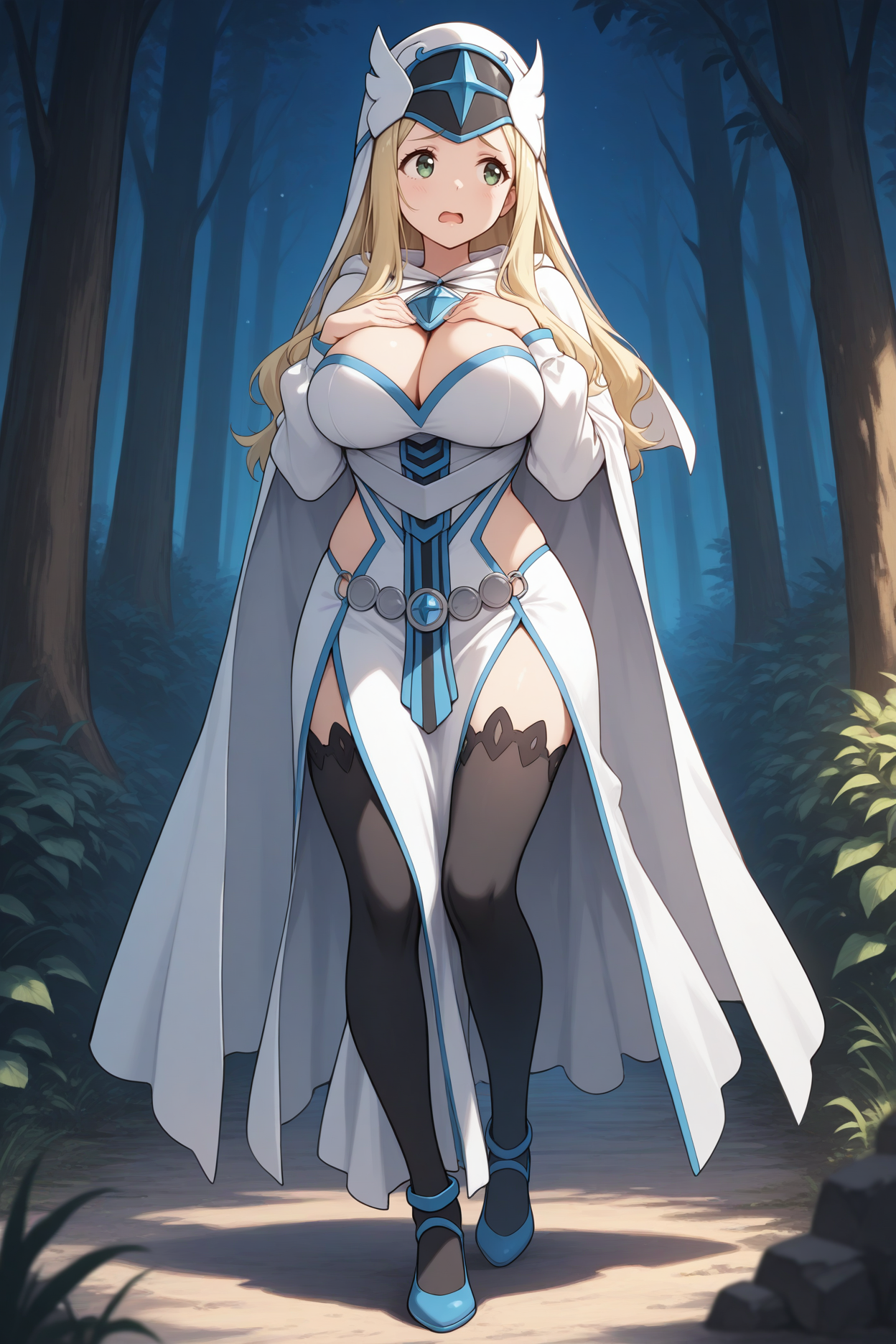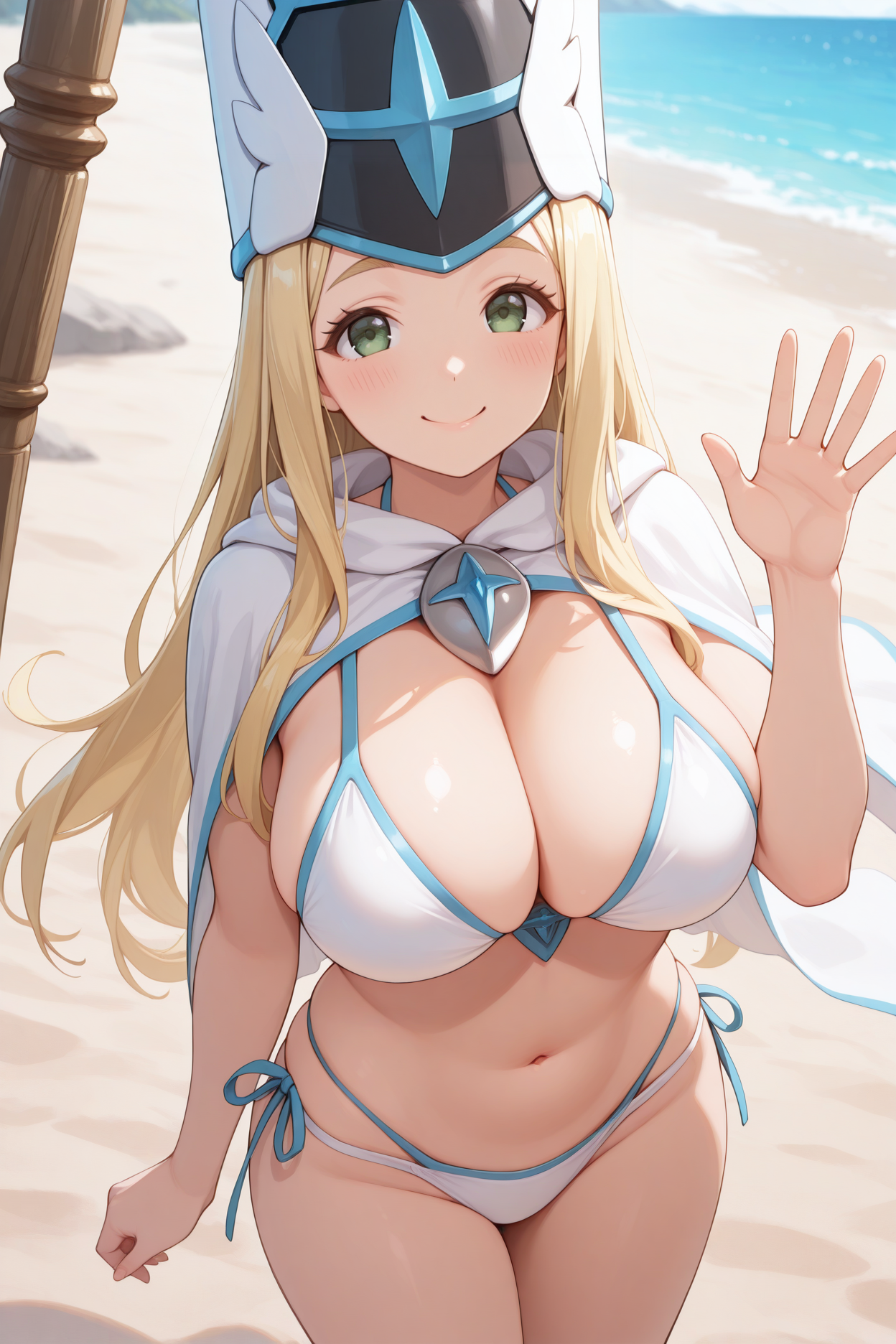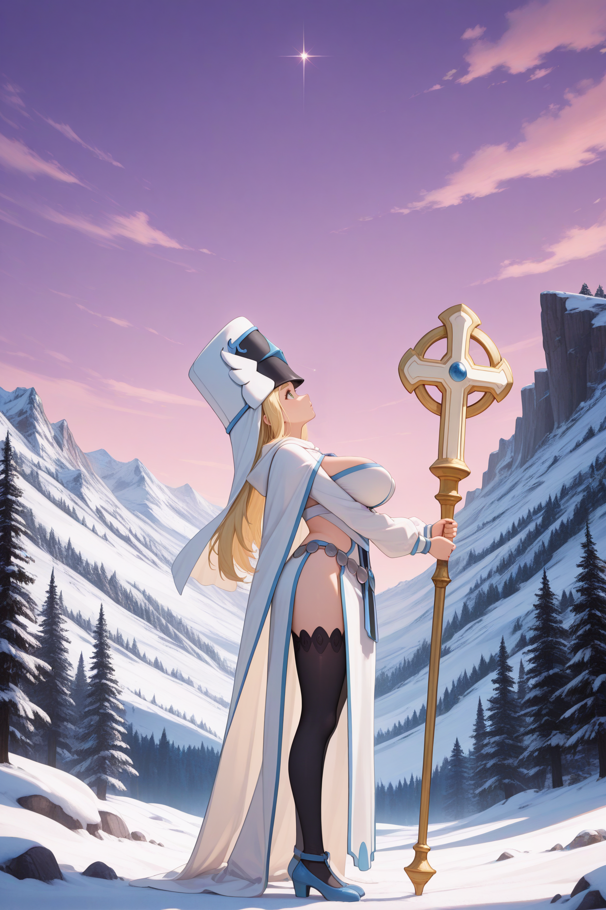 为表现她的典型造型,请添加 "尖顶帽、白色头饰、白色面纱、白色斗篷、白色连衣裙、无肩带连衣裙、长袖、臀部帘幕、黑色过膝袜、蓝色鞋子"。