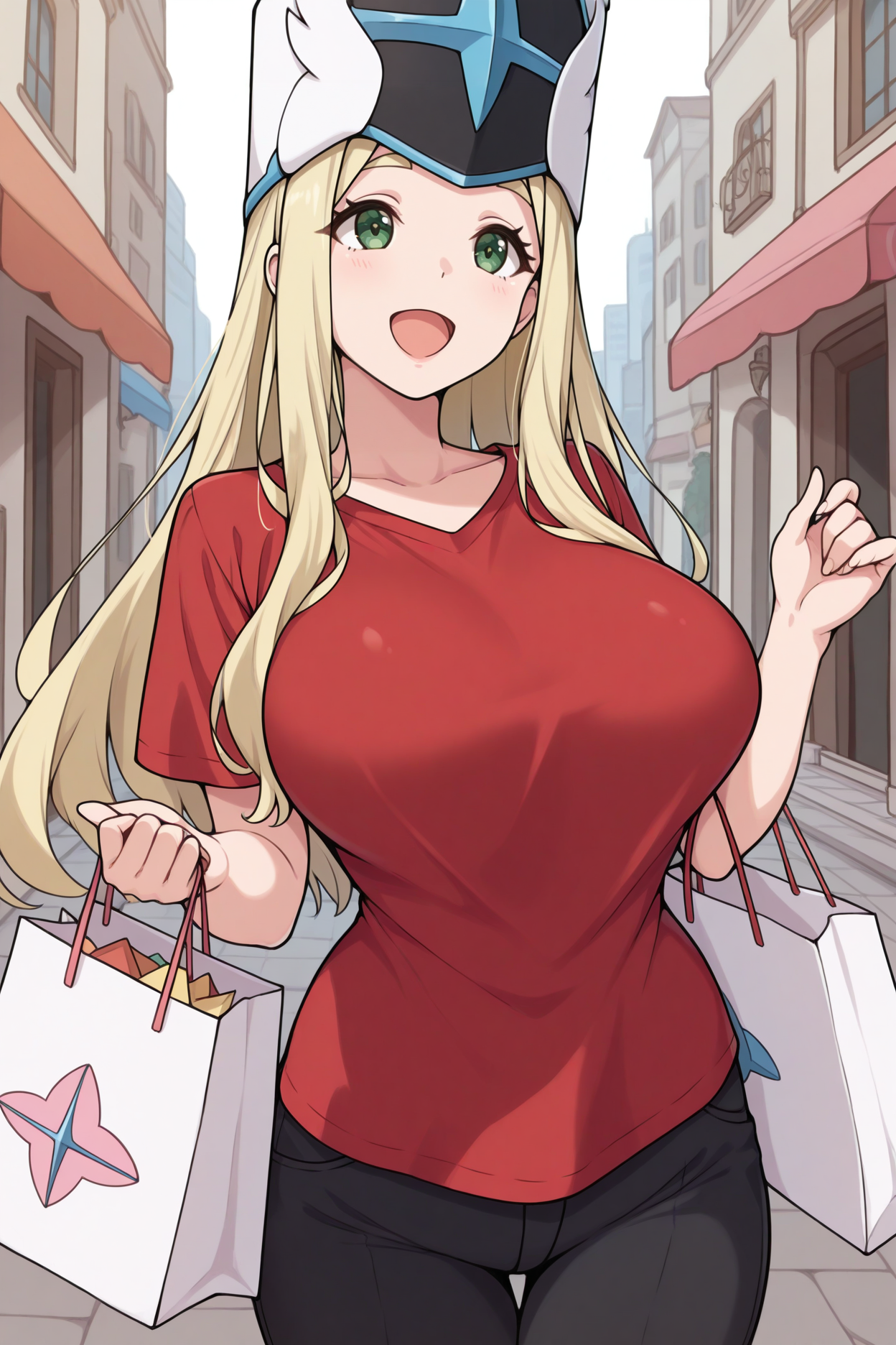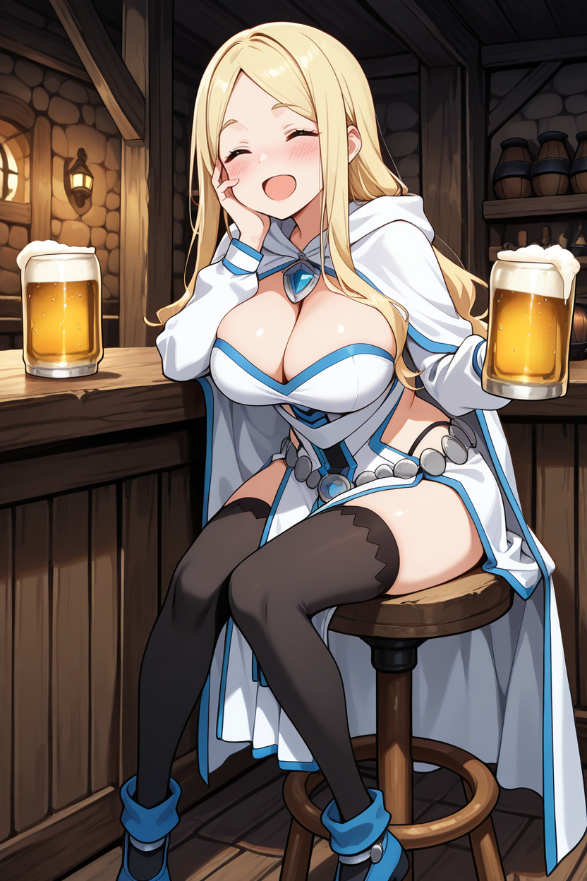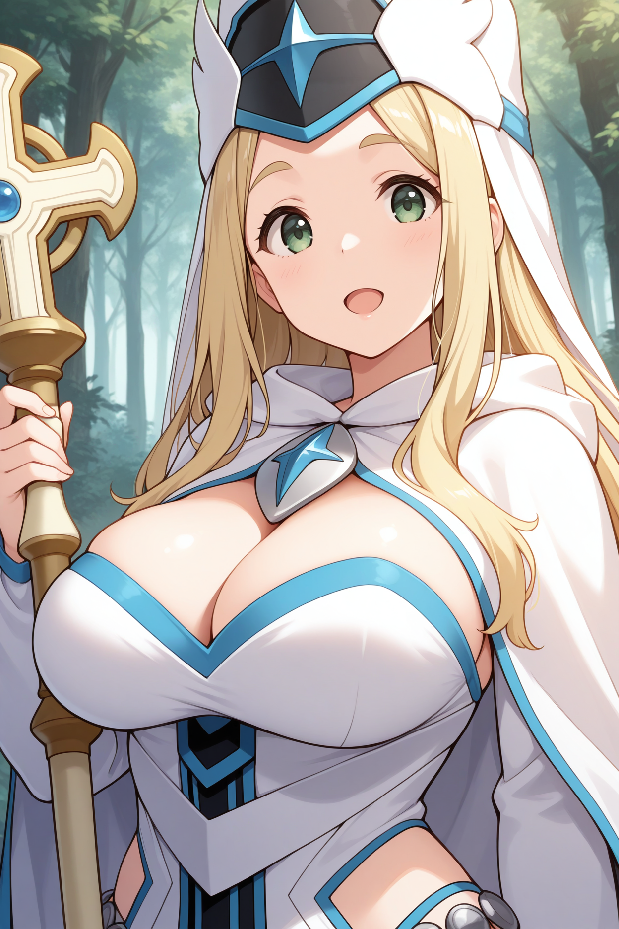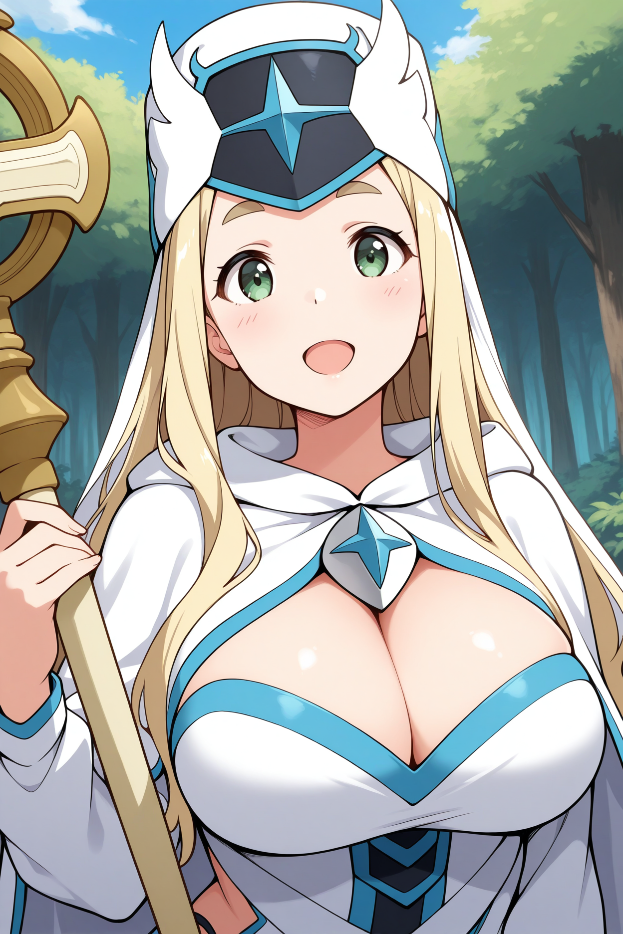 为表现她的典型造型,请添加 "尖顶帽、白色头饰、白色面纱、白色斗篷、白色连衣裙、无肩带连衣裙、长袖、臀部帘幕、黑色过膝袜、蓝色鞋子"。