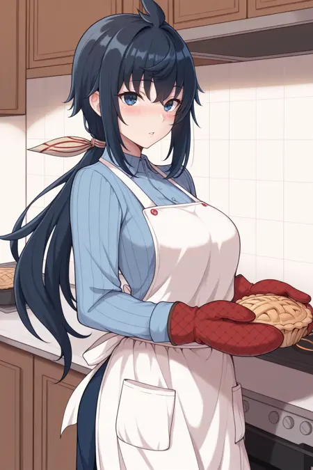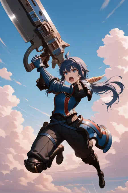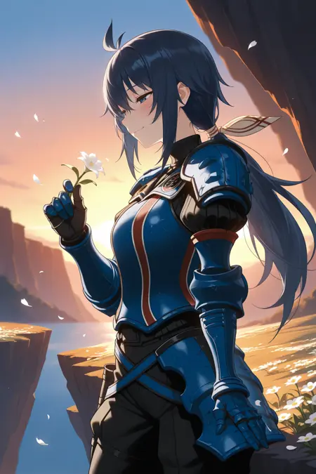 그녀의 전형적인 외모를 위해 "머리 리본, 어깨 갑옷, 파란 갑옷, 검은 터틀넥, 퍼프 슬리브, 장갑, 비대칭 장갑, 검은 바지, 무릎 보호대, 검은 부츠"를 추가하세요.