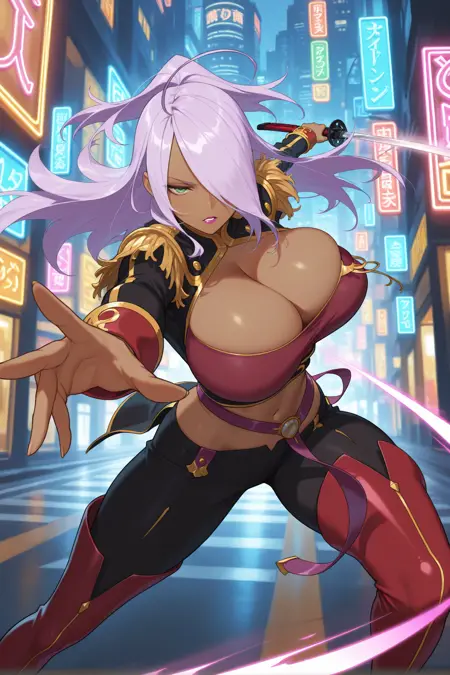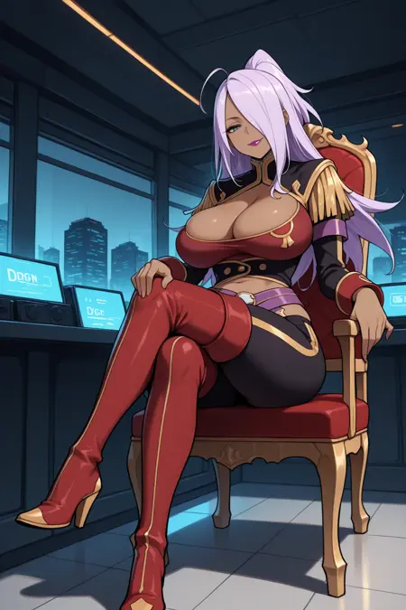 彼女の典型的な外見には「肩章、胸元の切り替え、黒いジャケット、短めのジャケット、赤いクロップトップ、お腹の部分、紫のベルト、黒いパンツ、赤い太ももブーツ」を追加してください。