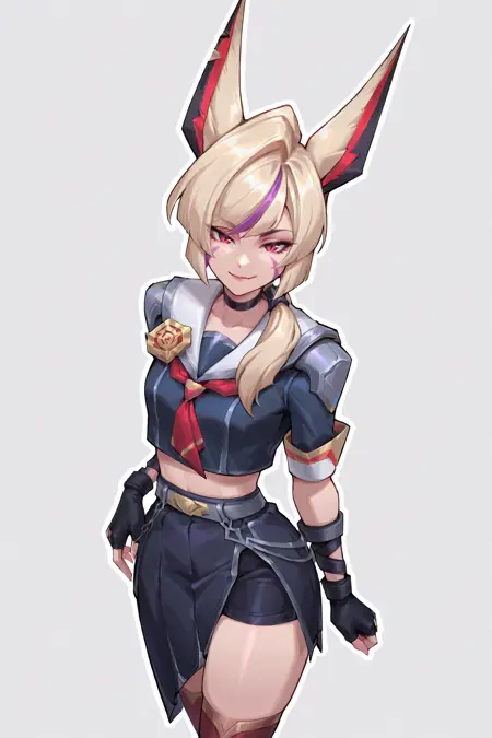 デフォルトのプロンプト: oms_ba_xayah, 1girl, 縦瞳, 動物の耳, 多色の髪, 学校の制服, バッジ, 腹出し, スカート, ショートパンツ, レッグウォーマー,