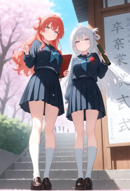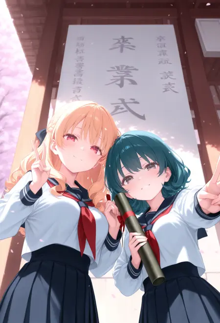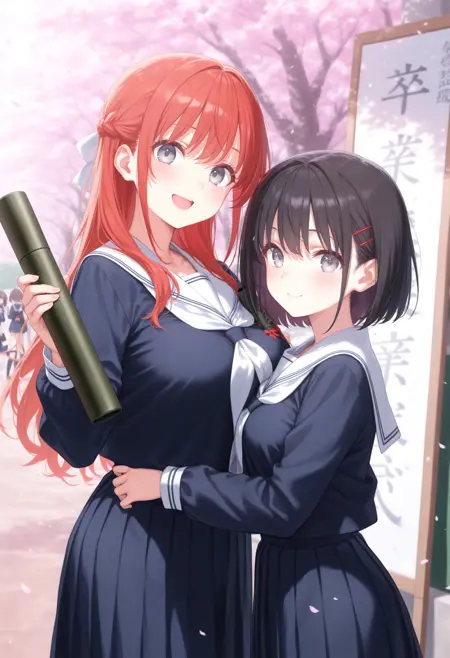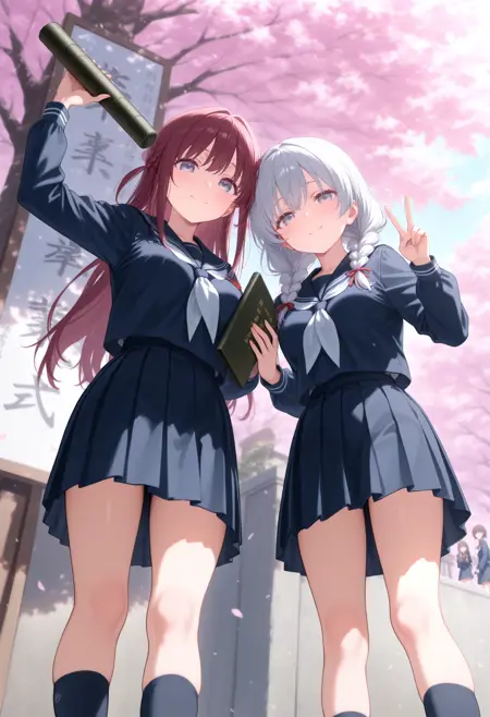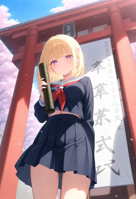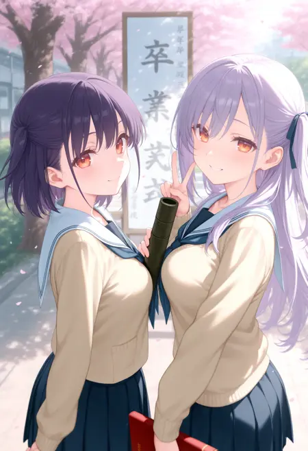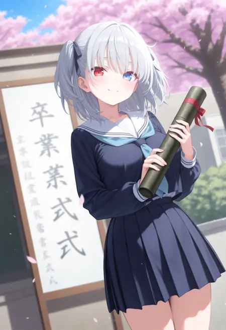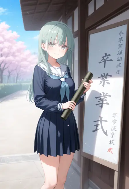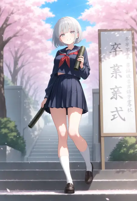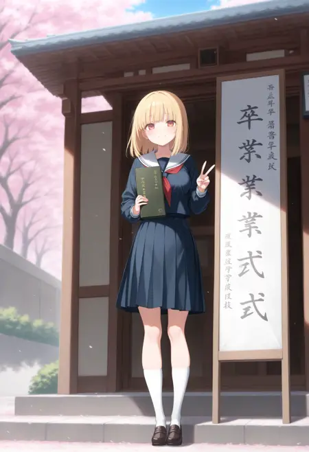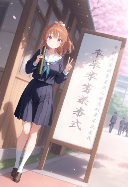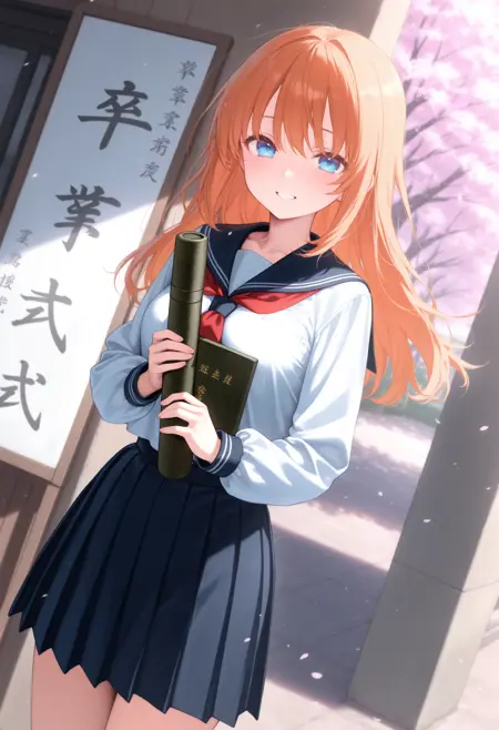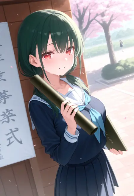 トリガーだけだと証書筒持つ程度なので diploma tube, cherry blossoms, outdoors, looking at viewer,long sleeves,big sign, holding book, school gateway,school 辺りを入れると校門付近の看板前で写真を撮る用な構図になるので後はご自由なポーズを指定して下さい。