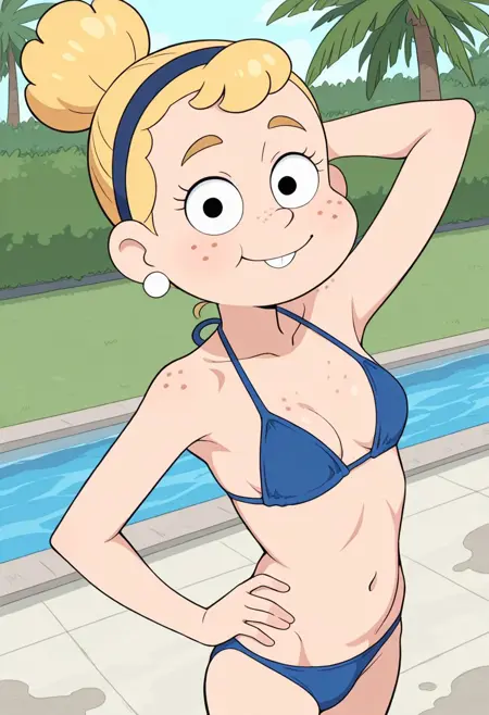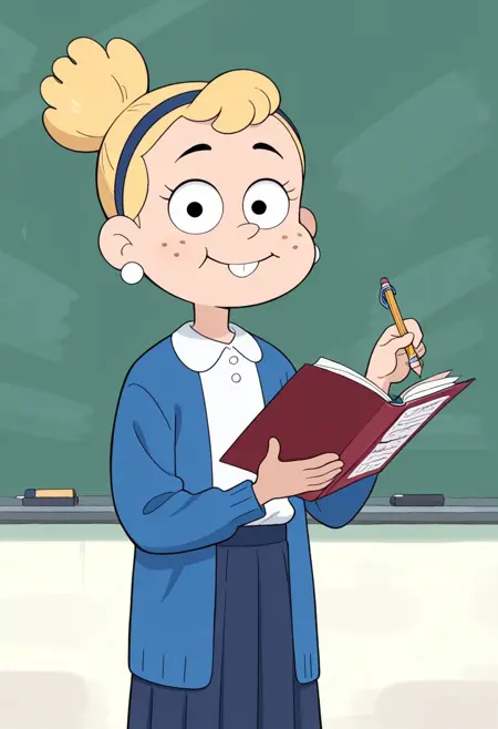 1girl, solo, Ms.Julip_C, 薄い肌, 黒い目, 金髪, フワフワの高いツインテール風の結び髪, そばかす, 丸い頬, 円形の出っ歯, 濃い青のヘアバンド, 白い丸いイヤリング