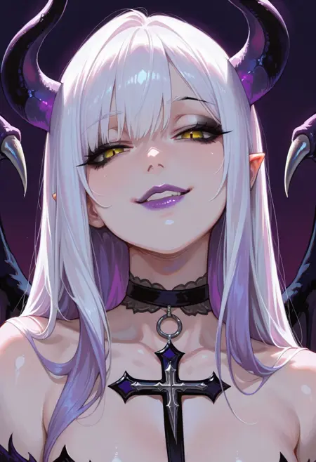 1girl, Morgana-IL, succubus, long hair, white hair, purple hair, yellow eyes, purple lipstick, black cross choker, large wings, sexy body