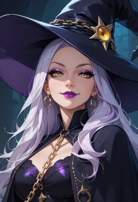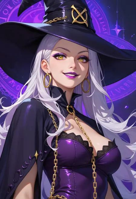 1girl, Morgana the Sorceress, long hair, white hair, purple hair, yellow eyes, purple lipstick, black witch hat, chain on hat, sexy body,
