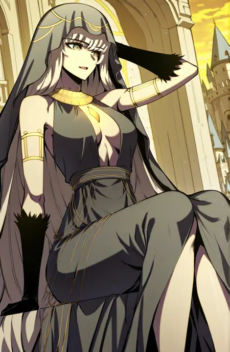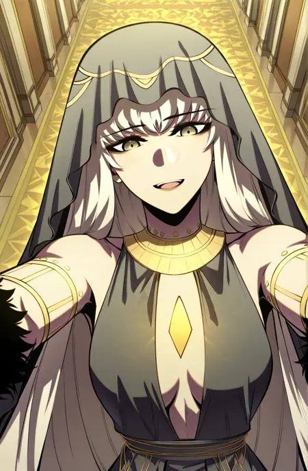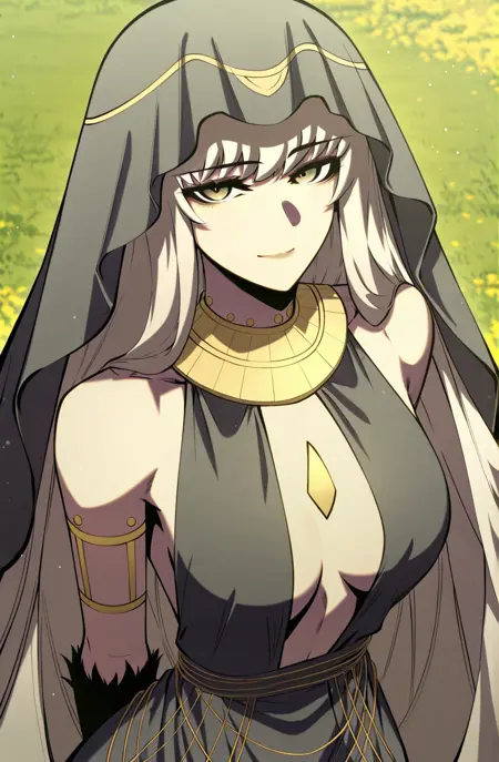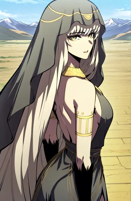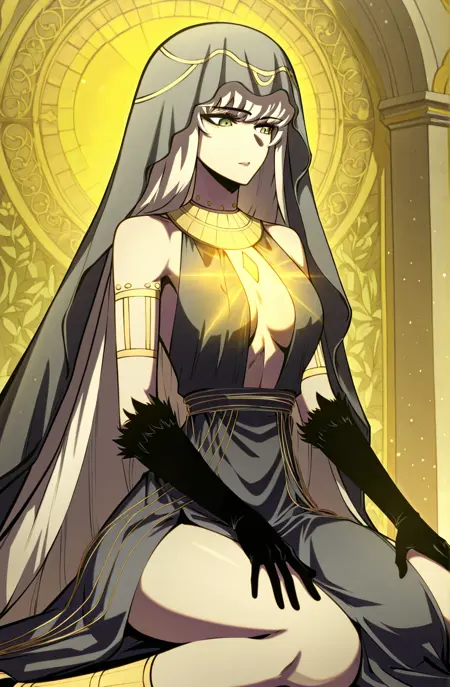 Vahn, 1 girl, solo, gold eyes, very long hair, grey hair, straight hair, messy hair, wavy tips, thick bangs, medium skin, veil, gold-trimmed veil,