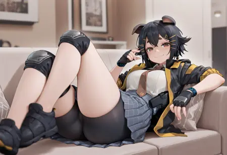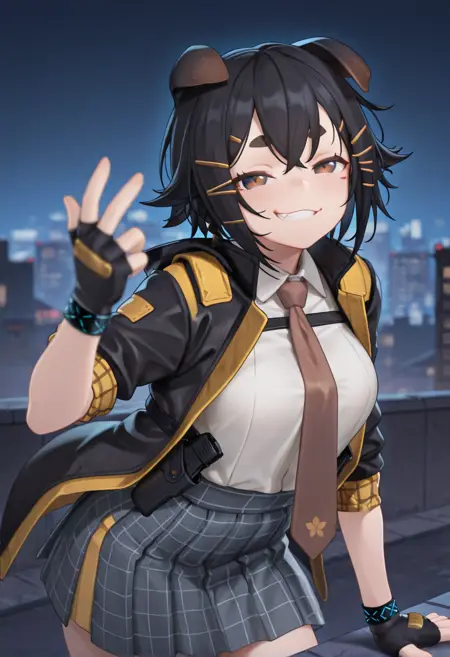 base skin, hooded jacket, hood down, open black jacket, brown necktie, white shirt, rolled up sleeves, fingerless gloves, grey skirt, pleated skirt, plaid skirt, skirt, shorts under skirt, bike shorts, black shorts, thigh strap, knee pads, shoes,