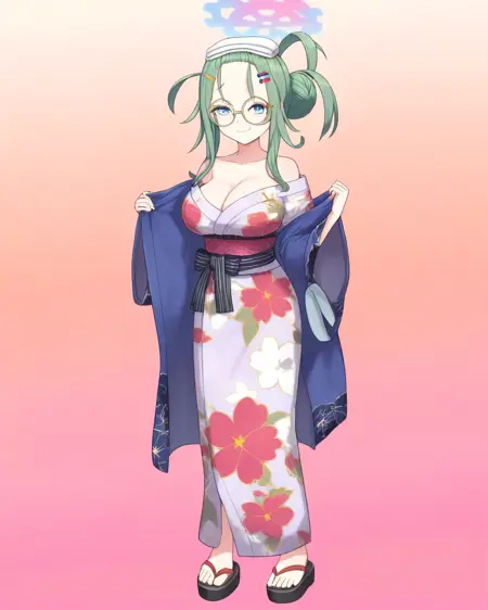 Use meruonsen, halo, blue eyes, long hair, green hair, hair bun, bangs pinned back, forehead, hairclip, towel on head, circular glasses, large breasts, kimono, sash, obi, floral print, zouri to summon her onsen variant