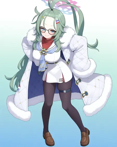 Use himekimeru, halo, blue eyes, long hair, green hair, bangs pinned back, huge ahoge, forehead, hairclip, glasses, black-framed eyewear, mask around neck, large breasts, winter clothes, white coat, fur-trimmed coat, turtleneck sweater, red sweater, white dress, short dress, white sailor collar, neckerchief, black pantyhose, thigh strap, loafers, brown footwear to summon her default outfit