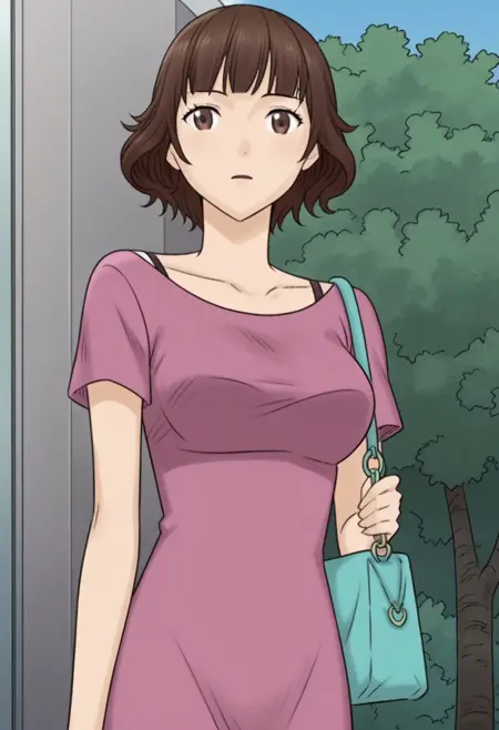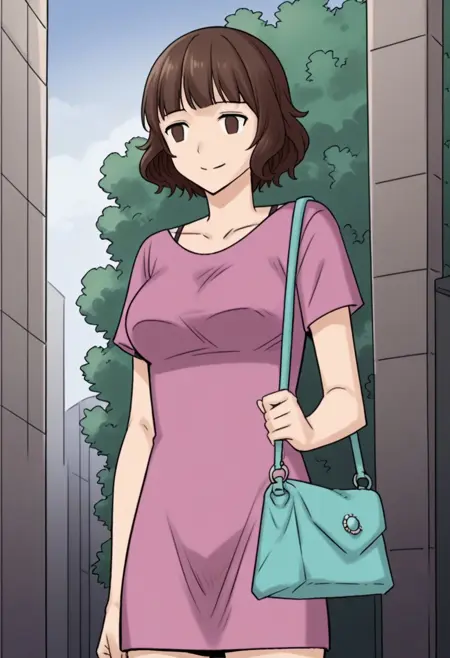 복장1: 드레스, 짧은 드레스, 짧은 소매, 가방, 핸드백, 하이힐,