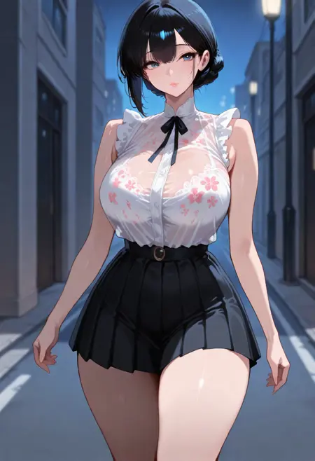使用触发词,此触发词必不可少 -> sheershirtaiaurora, 荷叶边衬衫, 透明, 花卉图案, 无袖,
