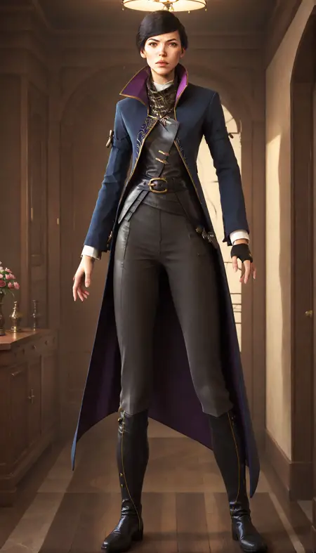 Full Body: D2_Emily, 1girl, solo, brown eyes, E_short black hair, E_dark blue long coat, E_gold embroidery, E_asymmetrical coat tail, E_face scarf, purple inner lining, E_leather vest, E_belt,black gloves, white cuffs, E_pants, E_knee-high black boots with gold zipper details, serious expression, full body, standing, fingerless gloves,steampunk aesthetic, aristocratic warrior, tactical attire, intricate detailing,