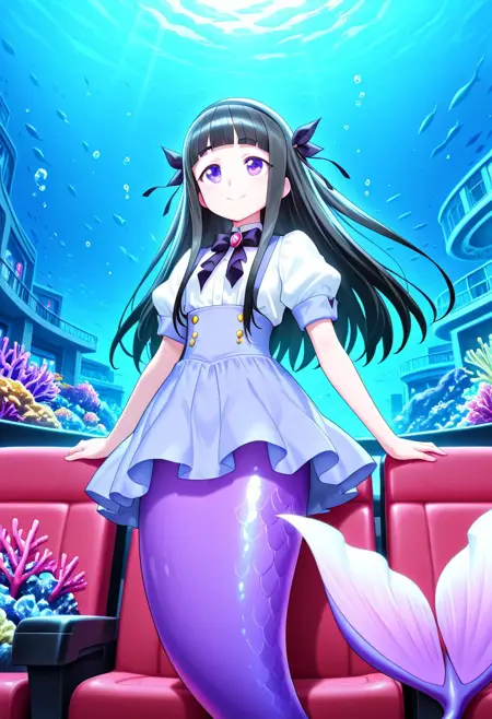 Appearance: black hair, long hair, blunt bangs, hairband, purple eyes, monster girl, mermaid, mermaid tail, purple tail