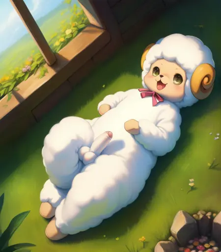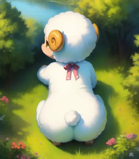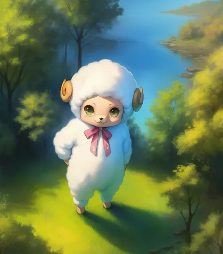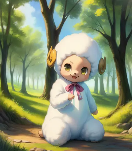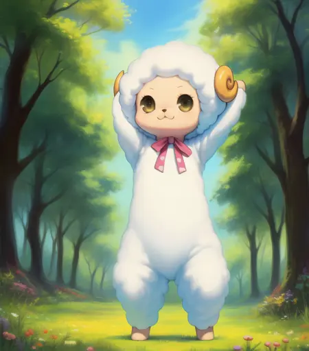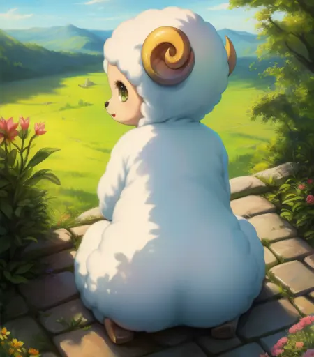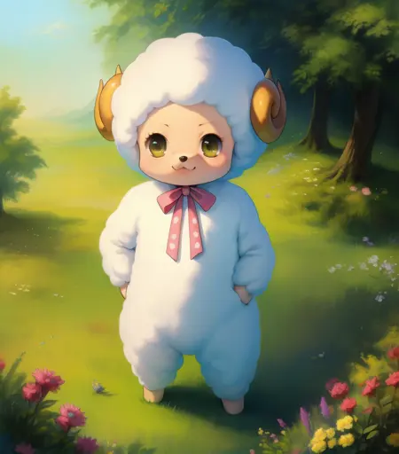 MacaronABPN1, sheep, white wool, brown eyes, neck ribbon, ram's horn, chibi, small body,