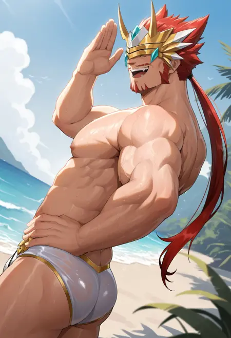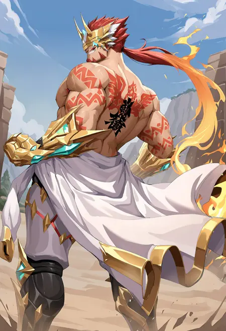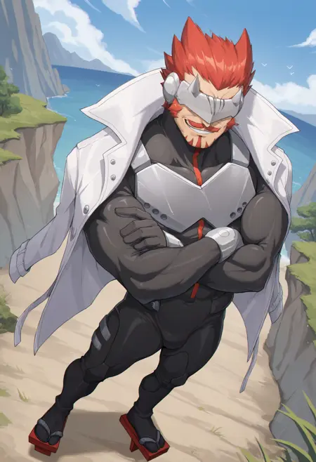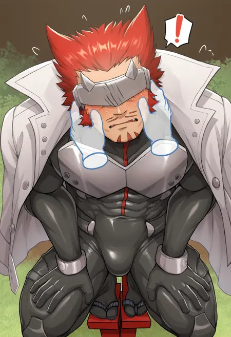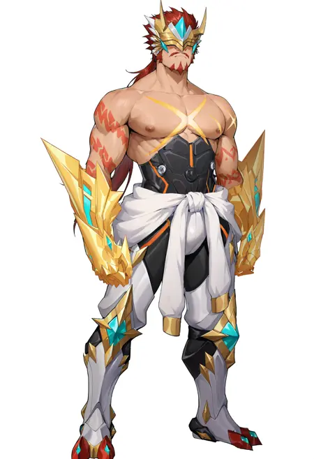 태그: gnkmnx, gnkmnx_mask, 빨간 머리, 얼굴 수염, 콧수염, 턱수염, 꼬리머리, 낮은 꼬리머리, 상반신 노출 남성, 십자 흉터, 가슴 흉터