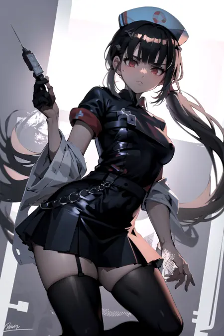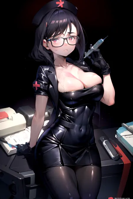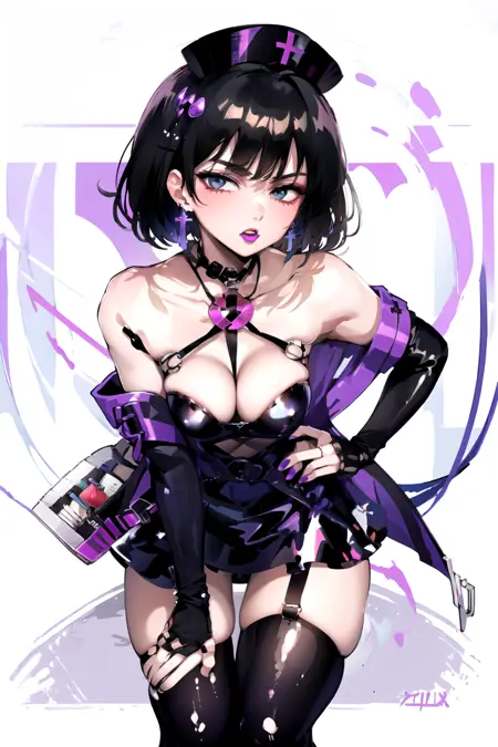 syringe, nurse, nurse_cap, hat, dress, earrings, short_sleeves, jewelry, white_dress, short_dress, collared_dress, holding_syringe, pink_dress, thigh_strap, skindentation, thighhighs, gloves, white_gloves, hair_ornament, black_thighhighs, white_footwear, sandals, zettai_ryouiki, hairclip, ring, black_pantyhose, bb_(swimsuit_mooncancer)_(second_ascension)_(fate), ribbon, hair_ribbon, swimsuit, bikini, fingerless_gloves, purple_bikini, belt, garter_straps, cleavage, black_gloves, black_dress, okita_souji_(koha-ace), latex, bow, black_bikini, elbow_gloves, latex_gloves, bikini_top_only, latex_legwear, partially unbuttoned, center/underboob opening, open clothes — 常用标签