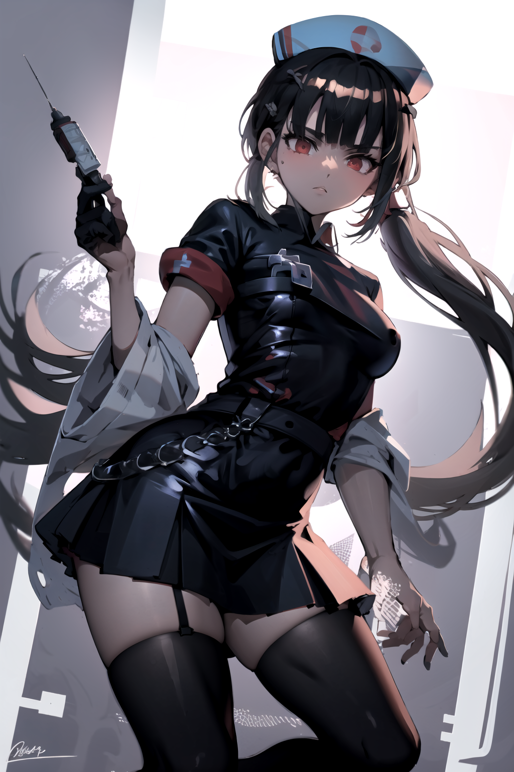 syringe, nurse, nurse_cap, hat, dress, earrings, short_sleeves, jewelry, white_dress, short_dress, collared_dress, holding_syringe, pink_dress, thigh_strap, skindentation, thighhighs, gloves, white_gloves, hair_ornament, black_thighhighs, white_footwear, sandals, zettai_ryouiki, hairclip, ring, black_pantyhose, bb_(swimsuit_mooncancer)_(second_ascension)_(fate), ribbon, hair_ribbon, swimsuit, bikini, fingerless_gloves, purple_bikini, belt, garter_straps, cleavage, black_gloves, black_dress, okita_souji_(koha-ace), latex, bow, black_bikini, elbow_gloves, latex_gloves, bikini_top_only, latex_legwear, partially unbuttoned, center/underboob opening, open clothes - Commonly used tags.