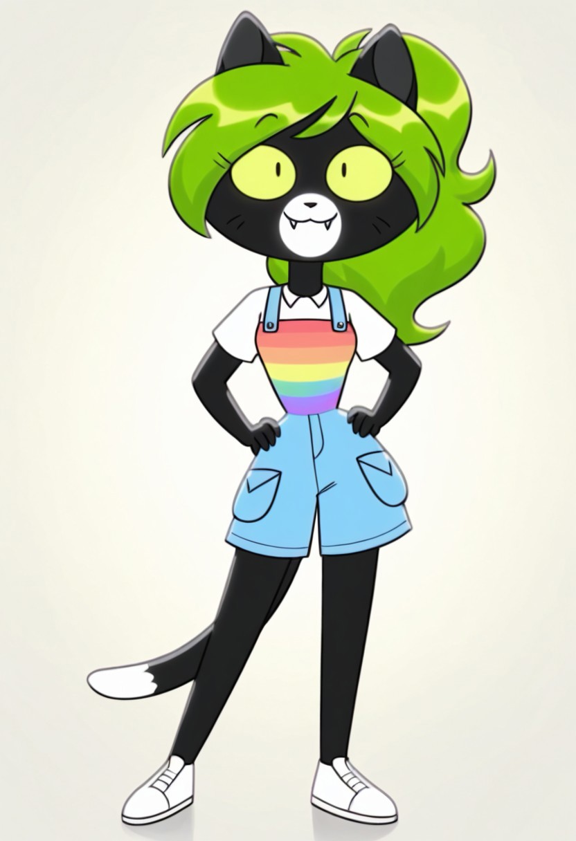 1girl, solo, cat girl, flo(rocky_rakoon), green hair, black and white skin, white shirt, rainbow striped overall tee, blue shorts, white shoes
