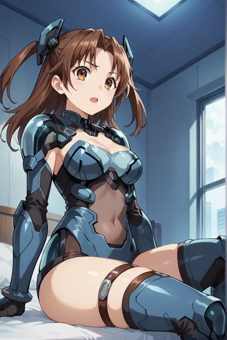 AST:mikie-oka, mikie-ast, 1girl, two side up, brown hair, brown eyes, solo, breasts, bodysuit, armor, mecha armor, cutout shoulders, open abdomen, thigh straps, armored boots, futuristic suit
