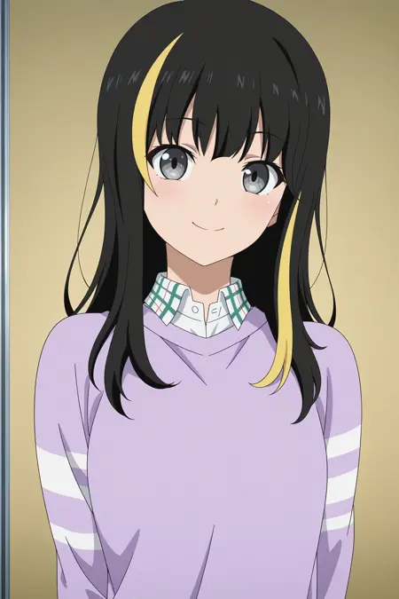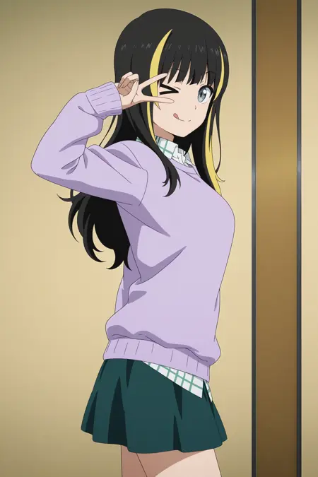 ando tsubaki, long hair, black hair, multicolored hair, streaked hair, grey eyes, long sleeves, purple sweater, white shirt, collared shirt, untucked shirt, green skirt, white socks, ankle socks, black footwear, boots