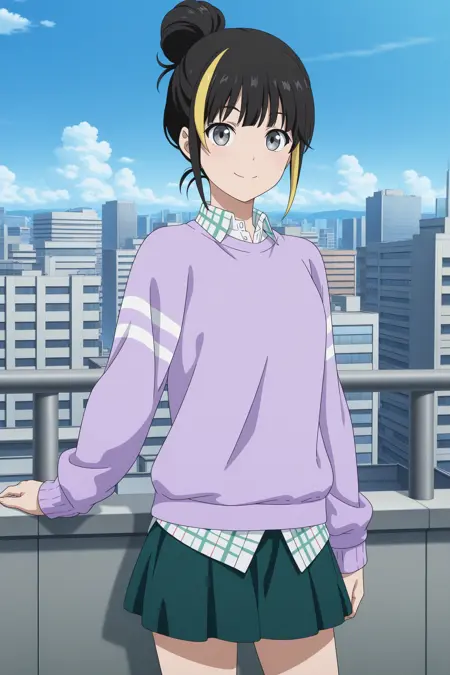 ando tsubaki, short hair, black hair, multicolored hair, streaked hair, single hair bun, sidelocks, grey eyes, long sleeves, purple sweater, white shirt, collared shirt, untucked shirt, green skirt, white socks, ankle socks, black footwear, boots