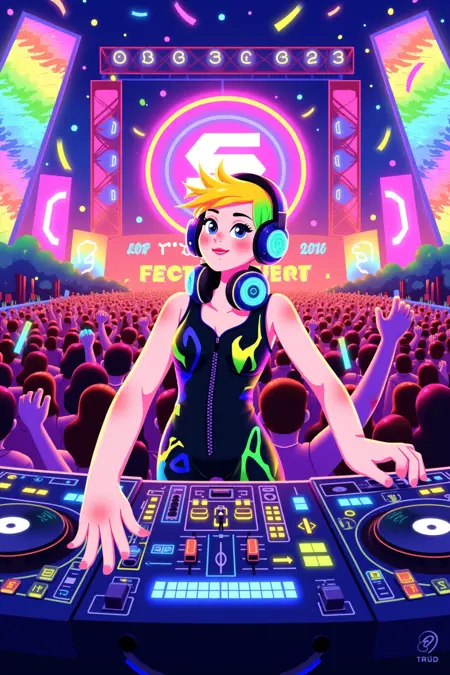ポジティブプロンプト:Vector illustration、キャラクターは画像の3分の2を占める、フラットスタイル、短く尖ったレインボーカラーの髪を持つ若い女性、ネオングリーン、ブルー、イエローの幾何学模様が施されたブラックのレザーロックジャンプスーツを着用、広々とした屋外音楽フェスティバルのステージに立ち、巨大なハイテクDJコンソールの前にて、巧みにコントロールを操作してトラックをミックス中。首には大きなノイズキャンセリングヘッドフォンをかけ、自信に満ちた微笑みを浮かべている。背景には、カラフルな旗やグロースティックを掲げる大勢のフェスティバル参加者たちが広がり、彼女の後方にはフェスティバルロゴが描かれた大きなカラフルなステージバックドロップがあり、その脇では他のミュージシャンたちが待機している。