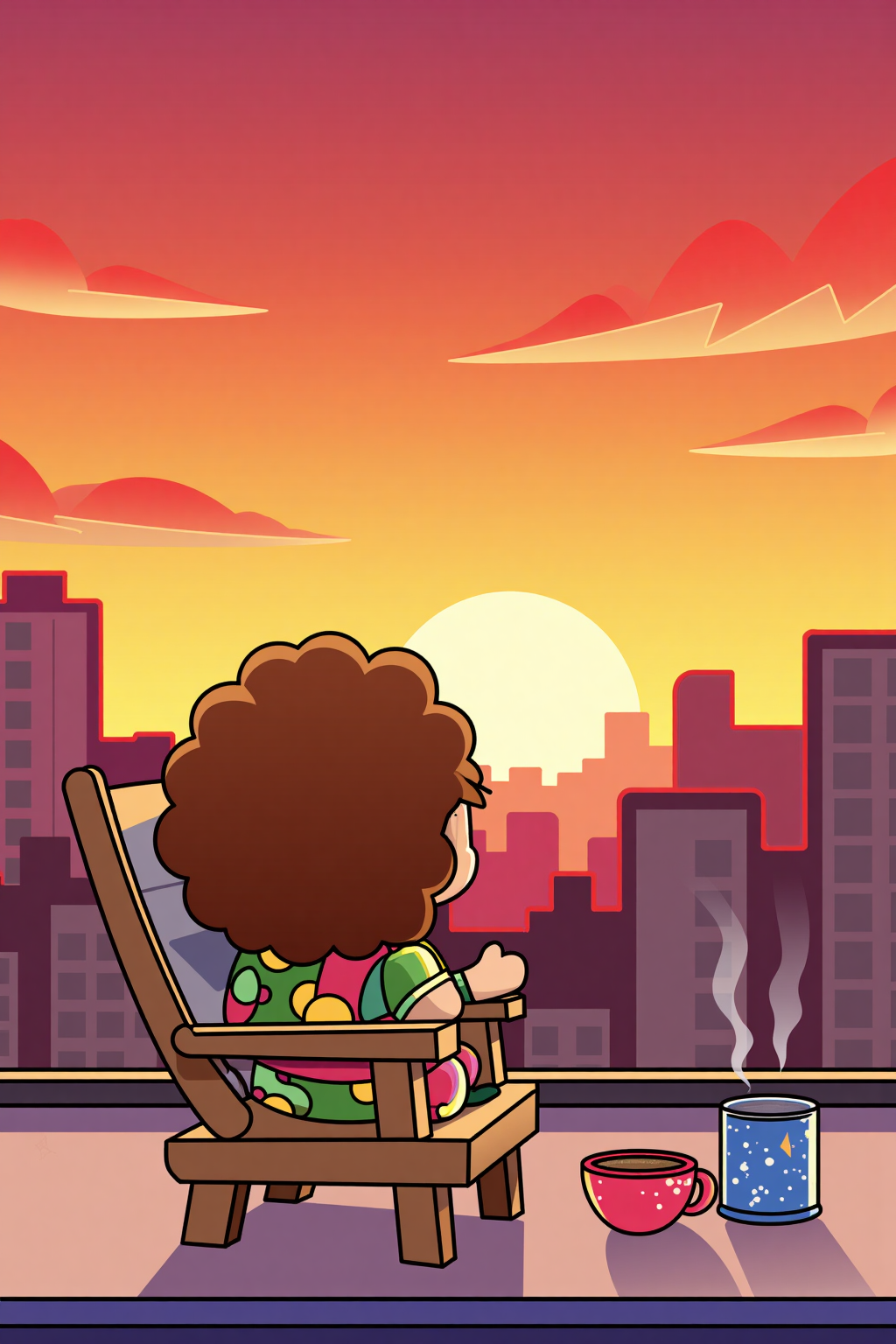 正向提示词:卡通矢量线,一个小女孩坐在屋顶上看日落,旁边有一把简单的木椅,身上裹着一条彩色毯子,手边放着一杯热可可,橙红色的夕阳染红了天空,