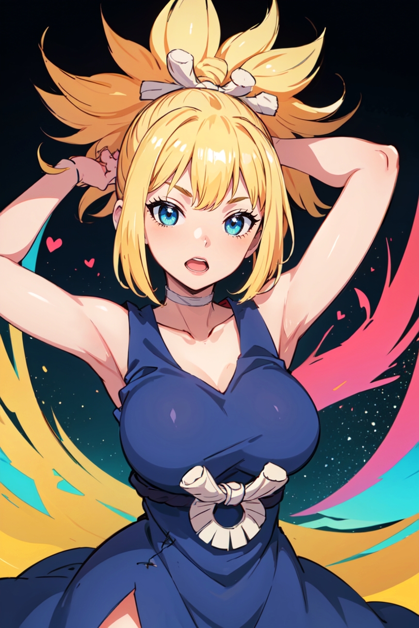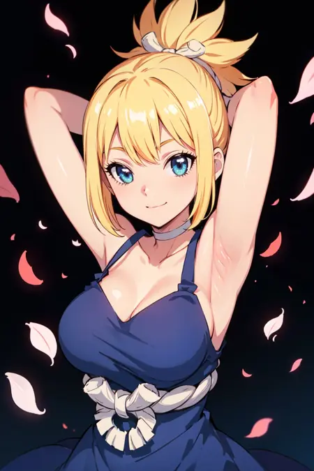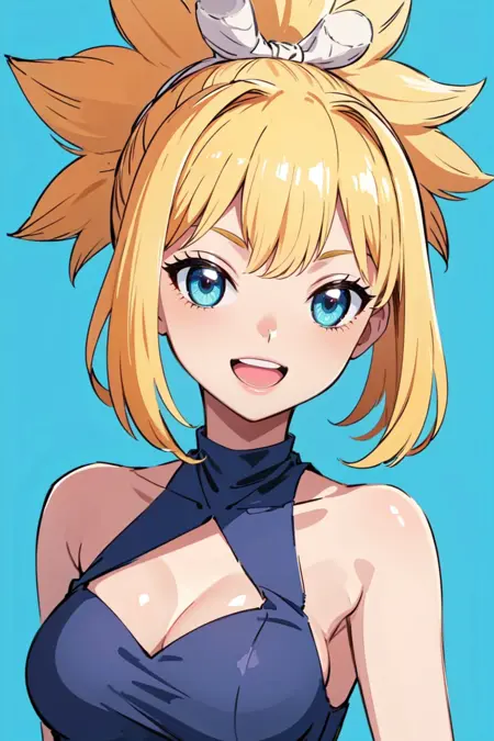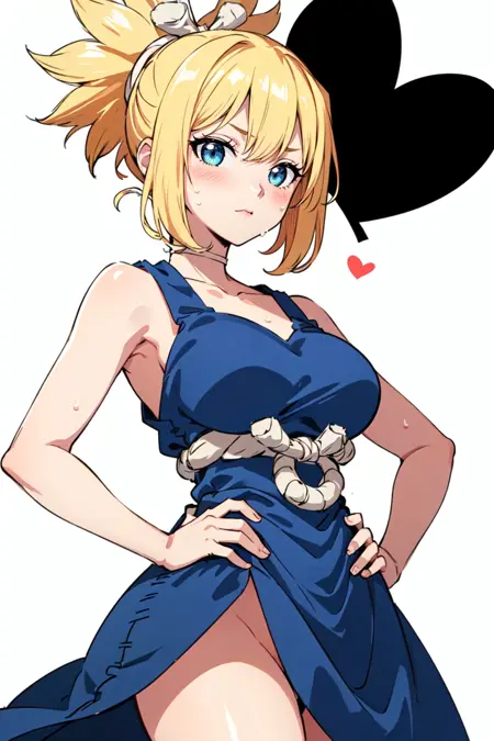 • 要还原她的原版服装,请使用以下标签:pikkykohaku, 1girl, solo, looking at viewer, blonde hair, ponytail, blue eyes, breasts, large breasts, dress, blue dress, sleeveless, thighs, bare shoulders, legs, smile